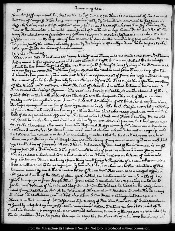 View full, authoritative transcriptions with page images of the diaries at John Quincy Adams Digital Diary part of the Primary Source Cooperative at the MHS.