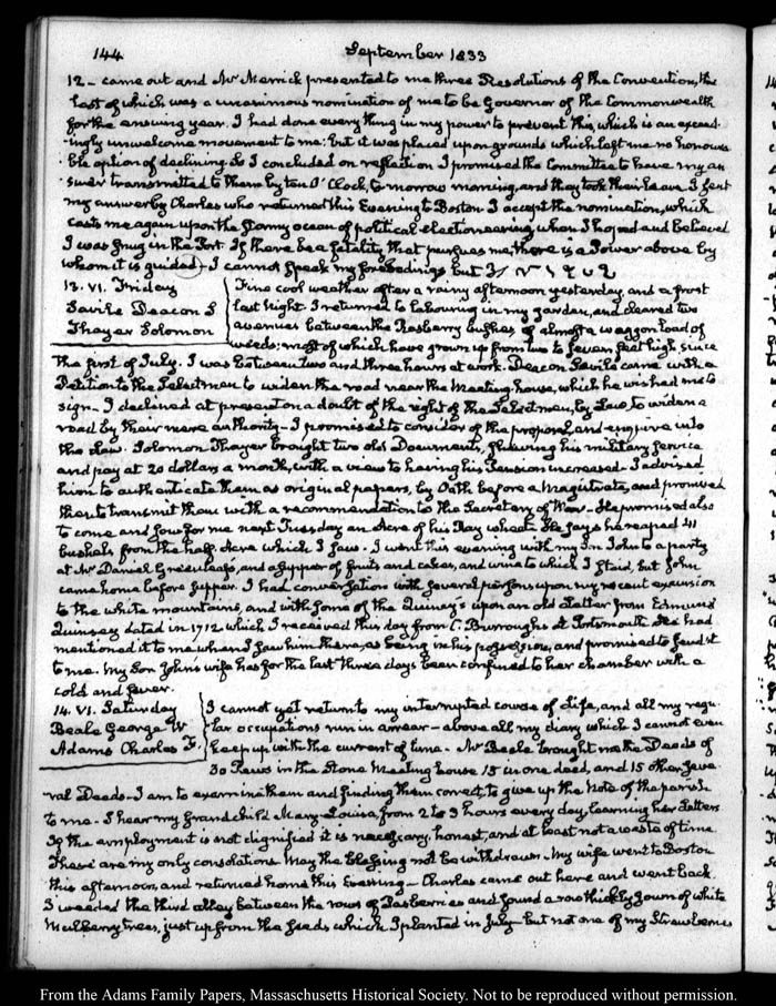 View full, authoritative transcriptions with page images of the diaries at John Quincy Adams Digital Diary part of the Primary Source Cooperative at the MHS.
