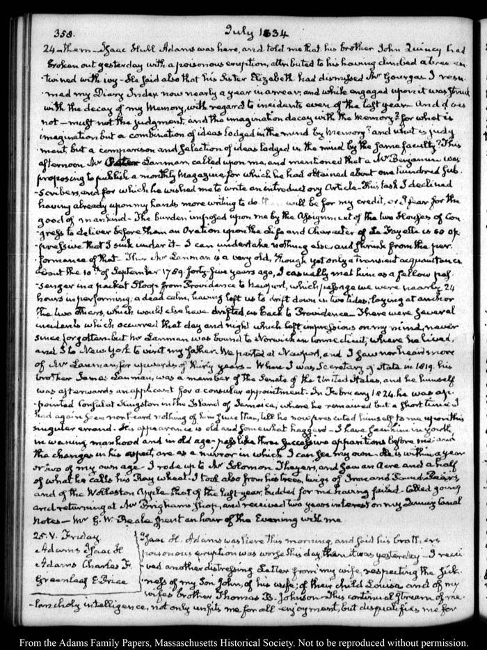 View full, authoritative transcriptions with page images of the diaries at John Quincy Adams Digital Diary part of the Primary Source Cooperative at the MHS.