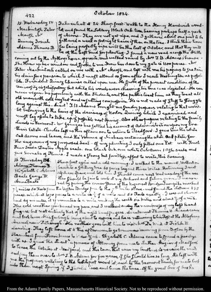 View full, authoritative transcriptions with page images of the diaries at John Quincy Adams Digital Diary part of the Primary Source Cooperative at the MHS.
