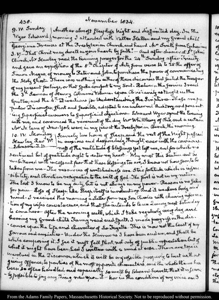 View full, authoritative transcriptions with page images of the diaries at John Quincy Adams Digital Diary part of the Primary Source Cooperative at the MHS.