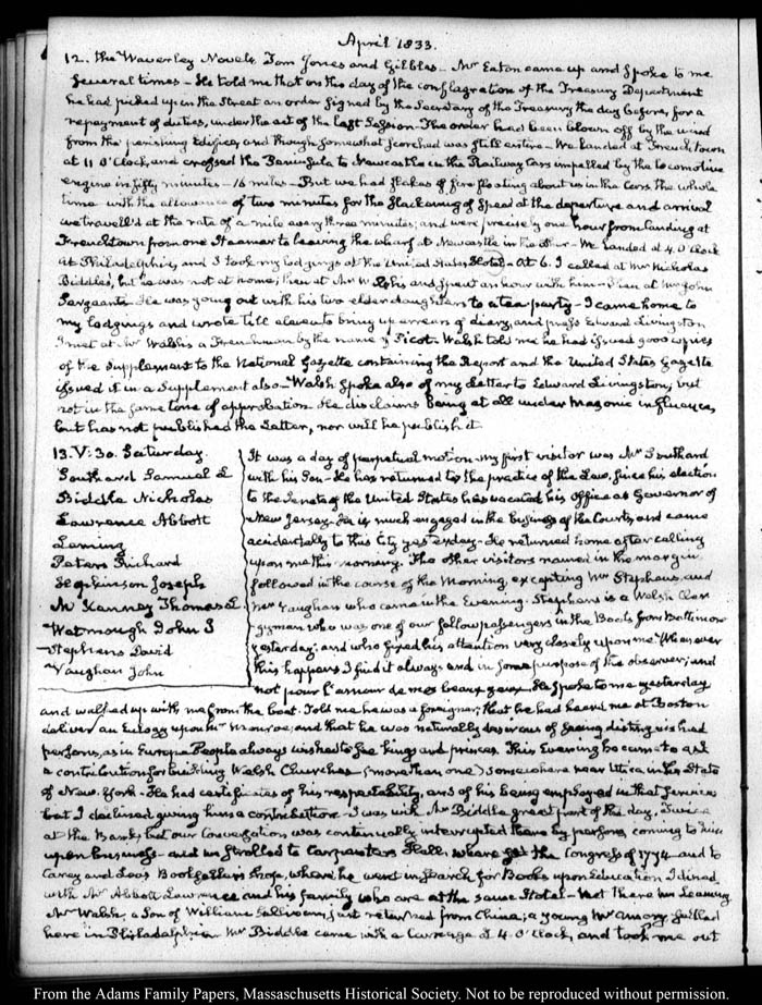 View full, authoritative transcriptions with page images of the diaries at John Quincy Adams Digital Diary part of the Primary Source Cooperative at the MHS.