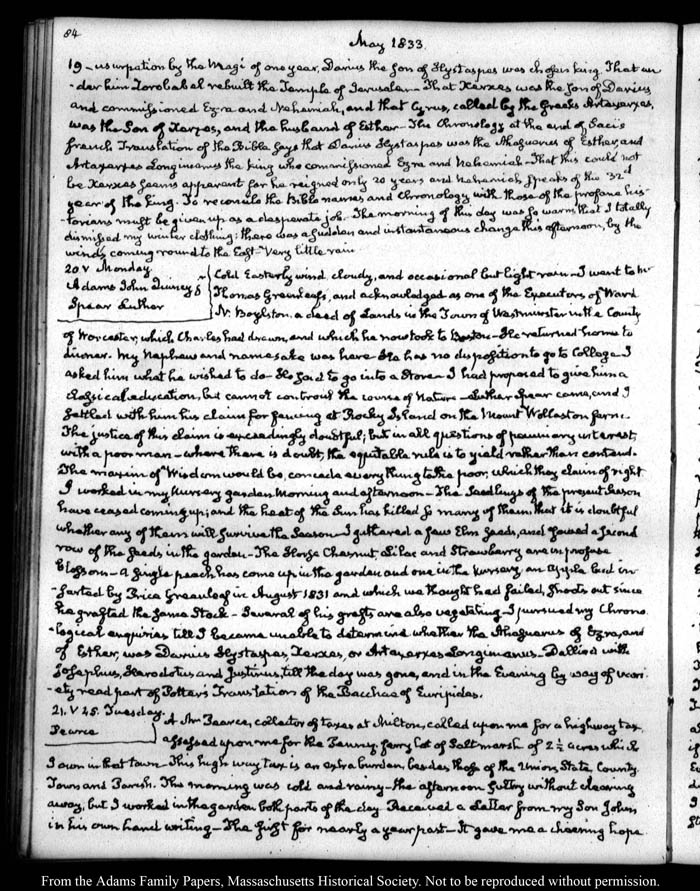 View full, authoritative transcriptions with page images of the diaries at John Quincy Adams Digital Diary part of the Primary Source Cooperative at the MHS.