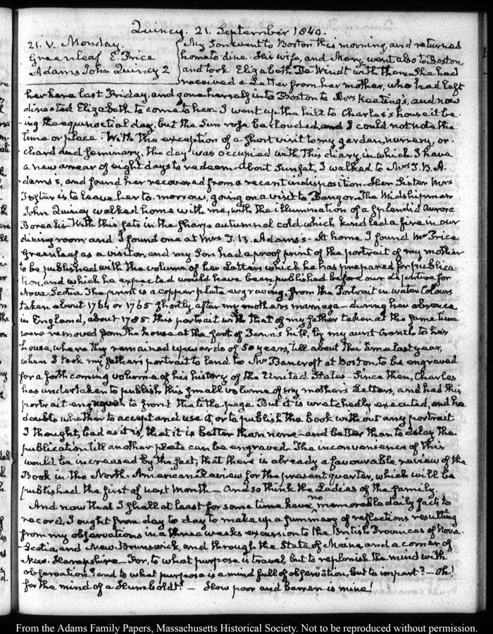 View full, authoritative transcriptions with page images of the diaries at John Quincy Adams Digital Diary part of the Primary Source Cooperative at the MHS.