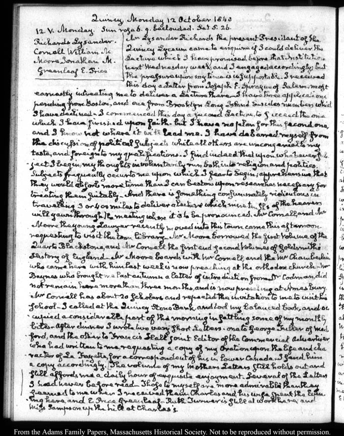 View full, authoritative transcriptions with page images of the diaries at John Quincy Adams Digital Diary part of the Primary Source Cooperative at the MHS.