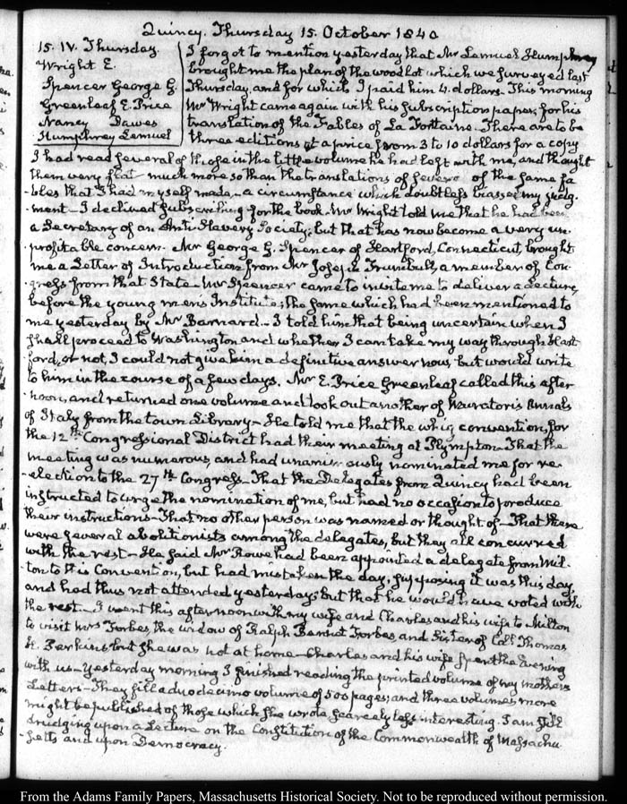 Quincy Thursday 15. October 1840.