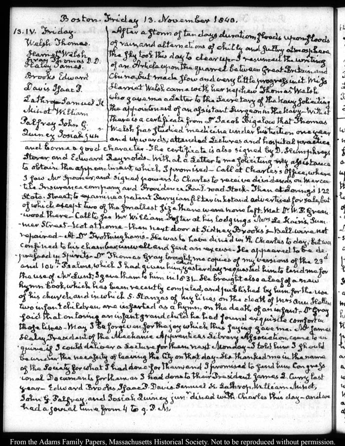 View full, authoritative transcriptions with page images of the diaries at John Quincy Adams Digital Diary part of the Primary Source Cooperative at the MHS.