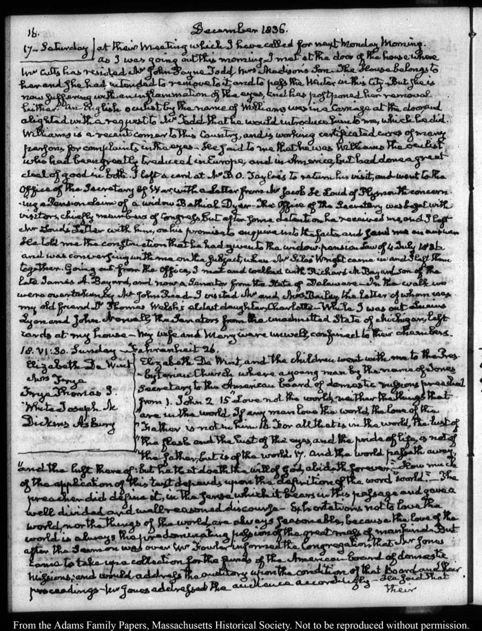 View full, authoritative transcriptions with page images of the diaries at John Quincy Adams Digital Diary part of the Primary Source Cooperative at the MHS.