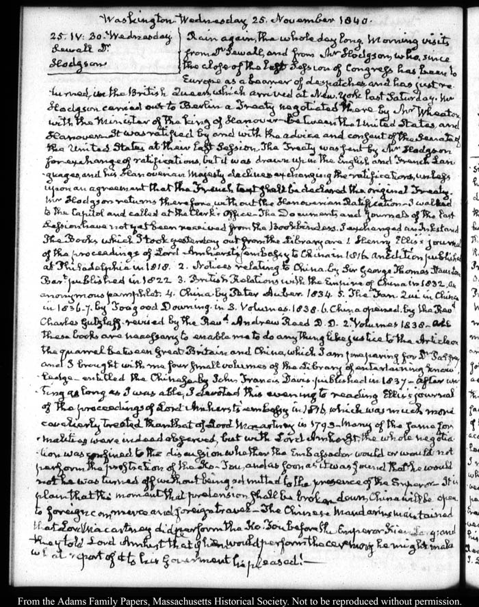 View full, authoritative transcriptions with page images of the diaries at John Quincy Adams Digital Diary part of the Primary Source Cooperative at the MHS.