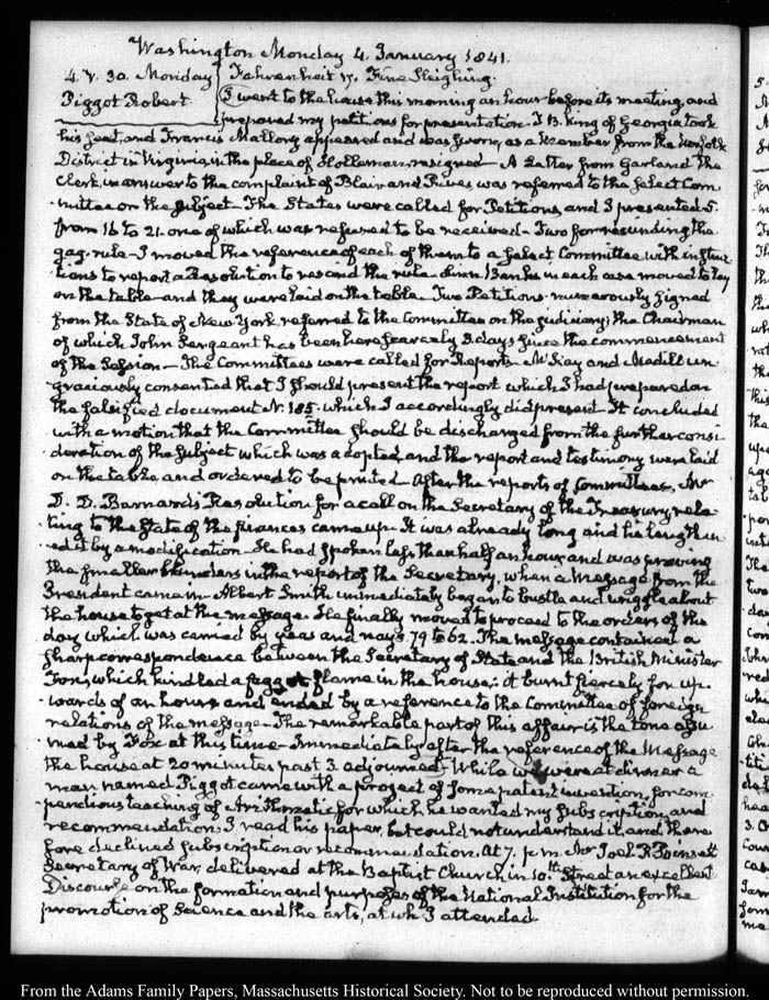 View full, authoritative transcriptions with page images of the diaries at John Quincy Adams Digital Diary part of the Primary Source Cooperative at the MHS.