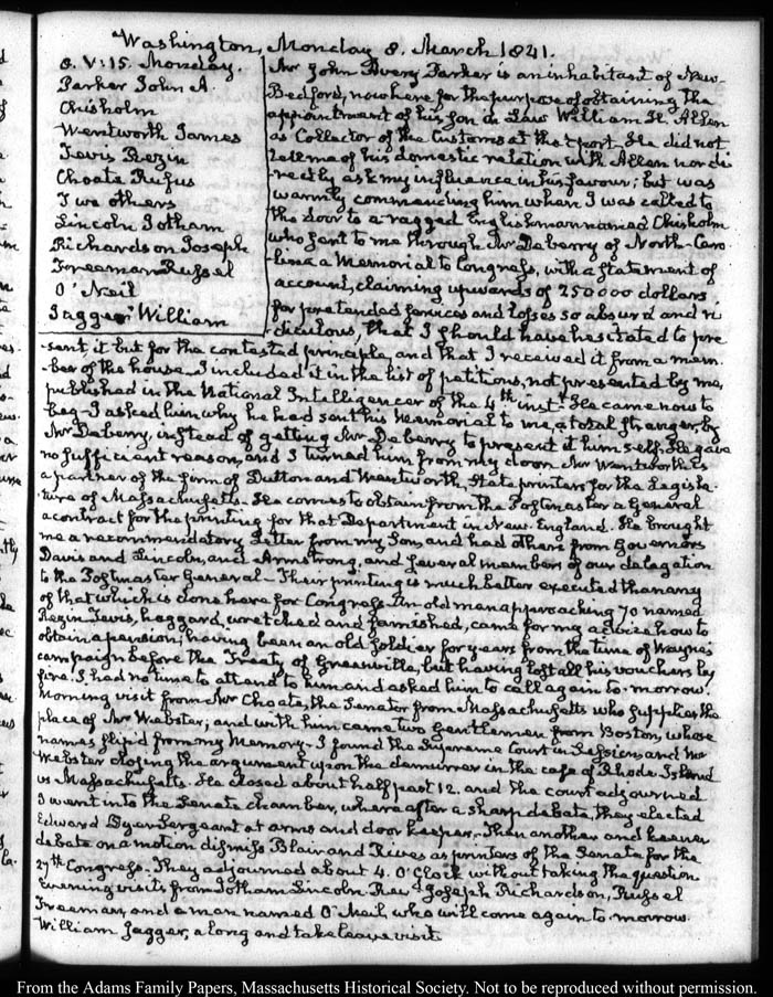 View full, authoritative transcriptions with page images of the diaries at John Quincy Adams Digital Diary part of the Primary Source Cooperative at the MHS.