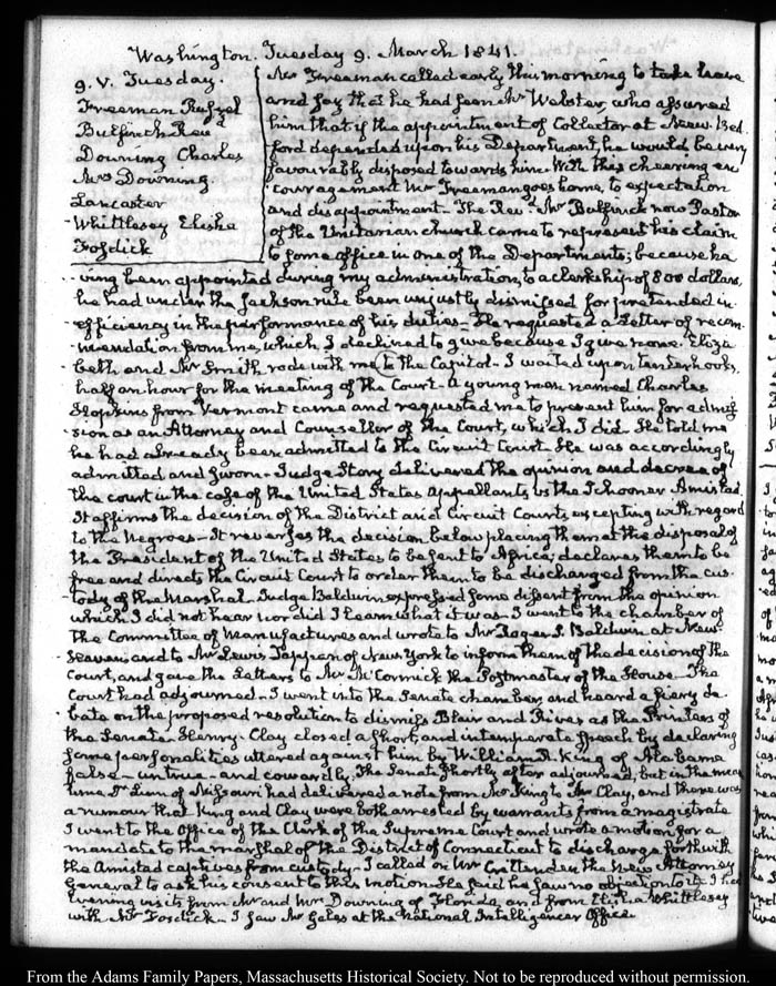 View full, authoritative transcriptions with page images of the diaries at John Quincy Adams Digital Diary part of the Primary Source Cooperative at the MHS.