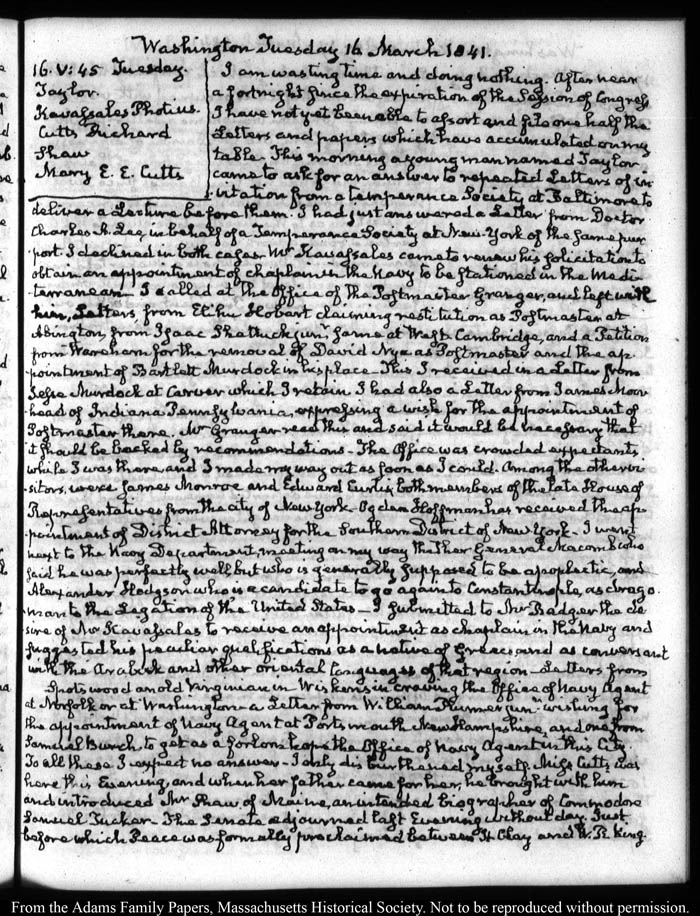 View full, authoritative transcriptions with page images of the diaries at John Quincy Adams Digital Diary part of the Primary Source Cooperative at the MHS.