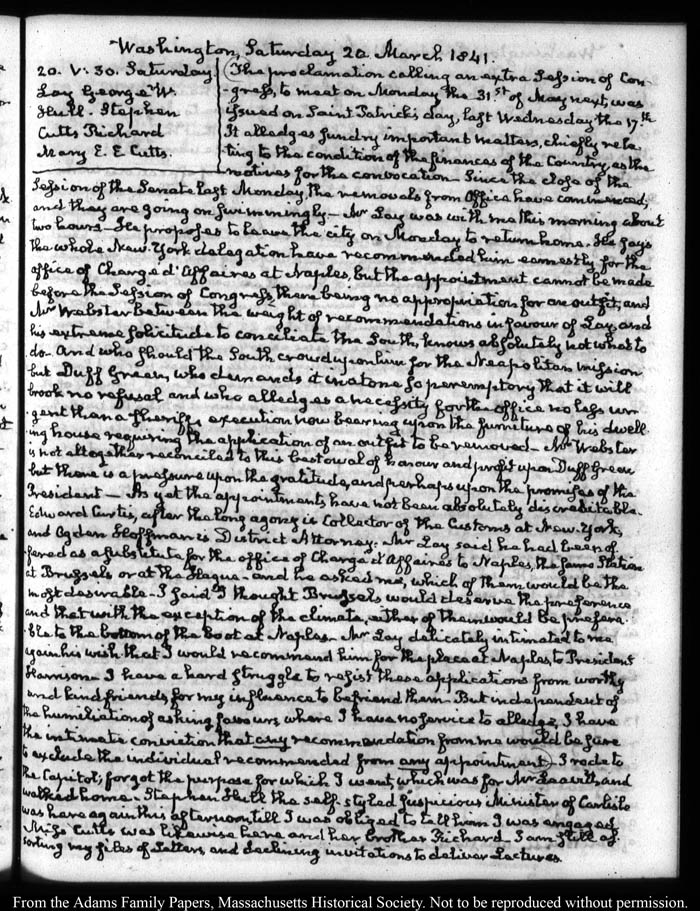 View full, authoritative transcriptions with page images of the diaries at John Quincy Adams Digital Diary part of the Primary Source Cooperative at the MHS.