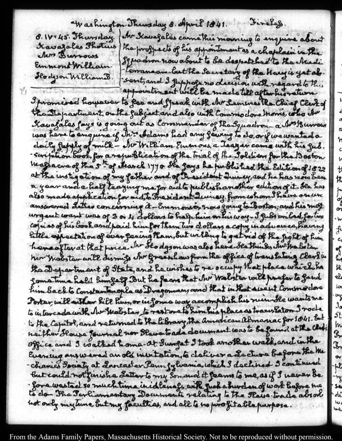 View full, authoritative transcriptions with page images of the diaries at John Quincy Adams Digital Diary part of the Primary Source Cooperative at the MHS.