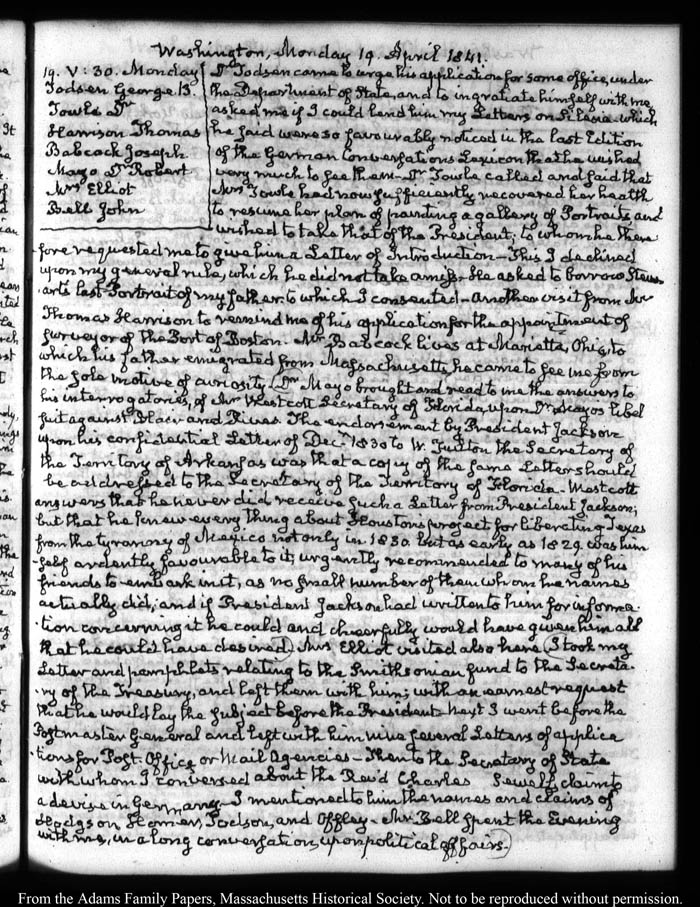 View full, authoritative transcriptions with page images of the diaries at John Quincy Adams Digital Diary part of the Primary Source Cooperative at the MHS.