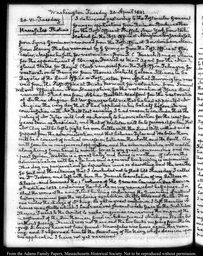 View full, authoritative transcriptions with page images of the diaries at John Quincy Adams Digital Diary part of the Primary Source Cooperative at the MHS.