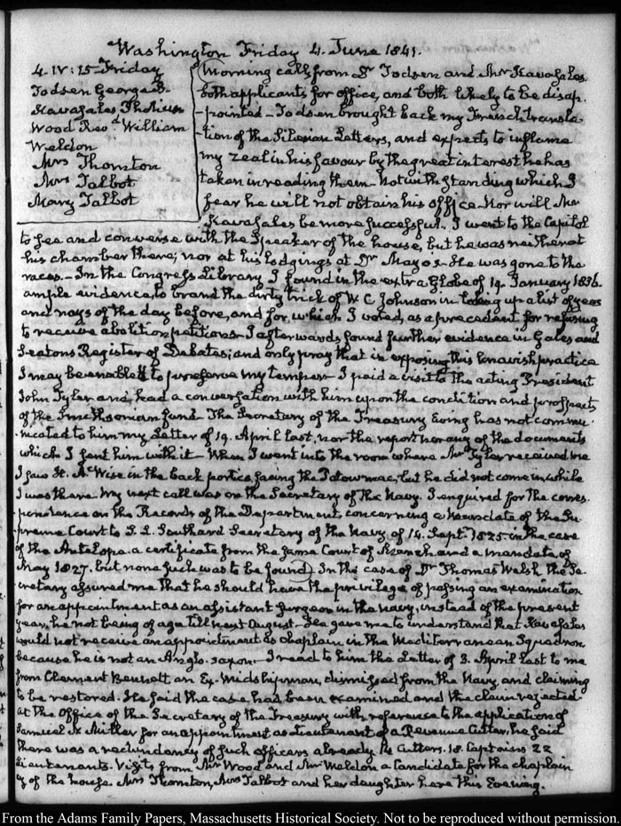 View full, authoritative transcriptions with page images of the diaries at John Quincy Adams Digital Diary part of the Primary Source Cooperative at the MHS.