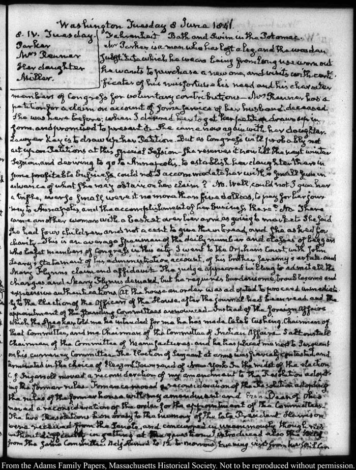 View full, authoritative transcriptions with page images of the diaries at John Quincy Adams Digital Diary part of the Primary Source Cooperative at the MHS.