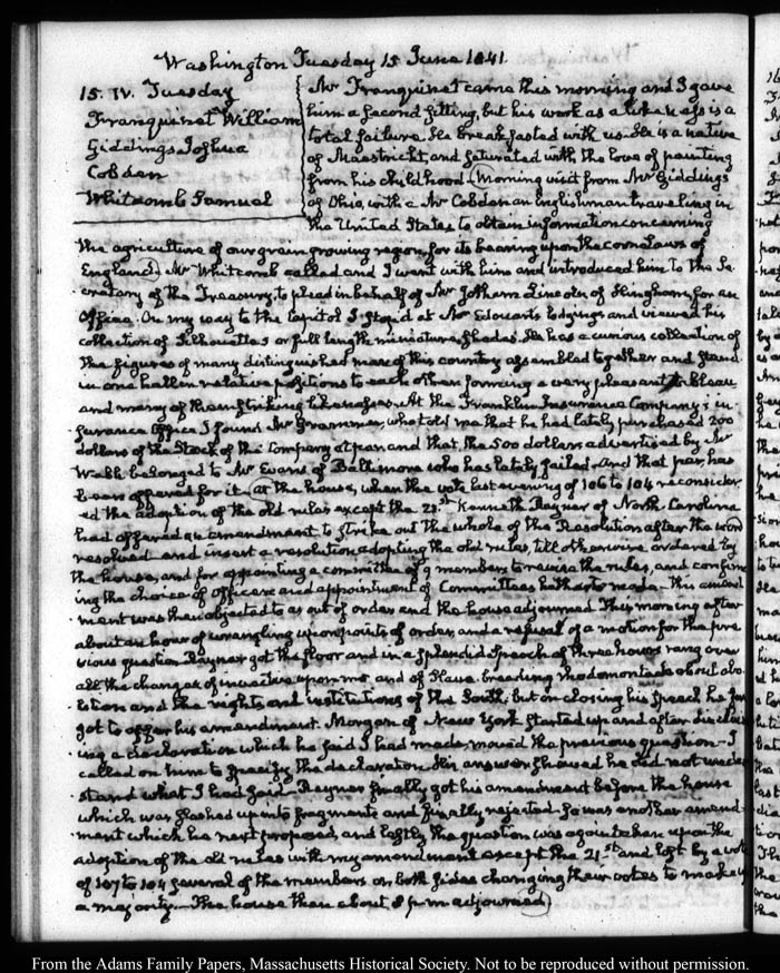 View full, authoritative transcriptions with page images of the diaries at John Quincy Adams Digital Diary part of the Primary Source Cooperative at the MHS.