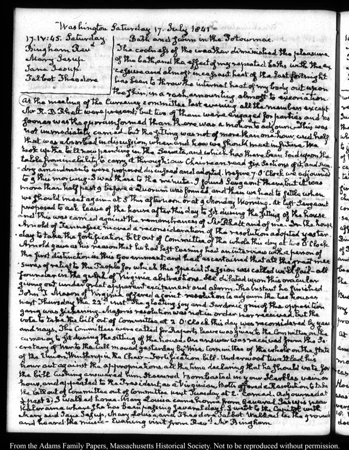View full, authoritative transcriptions with page images of the diaries at John Quincy Adams Digital Diary part of the Primary Source Cooperative at the MHS.
