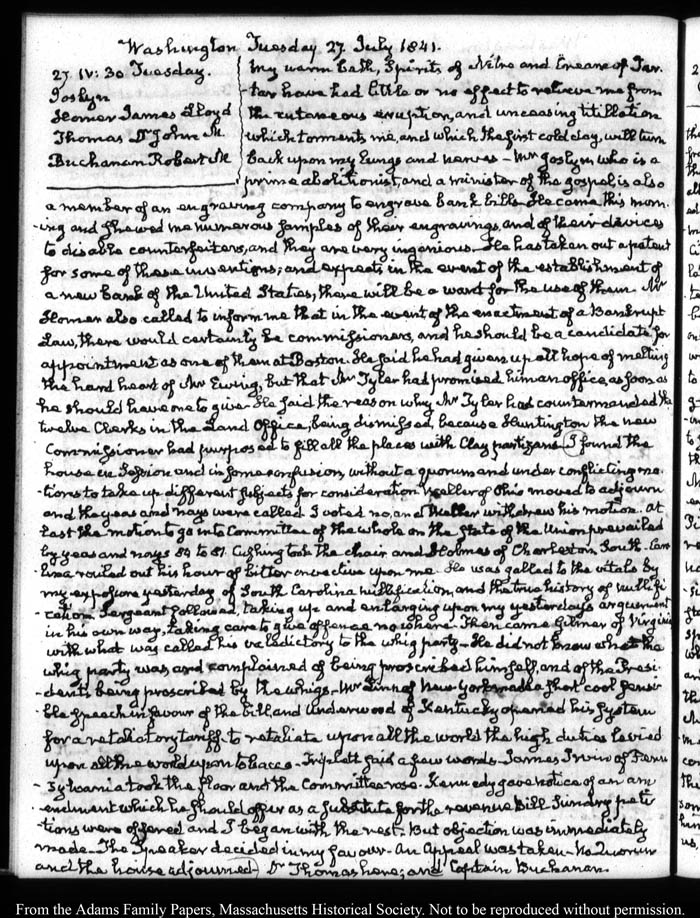 View full, authoritative transcriptions with page images of the diaries at John Quincy Adams Digital Diary part of the Primary Source Cooperative at the MHS.