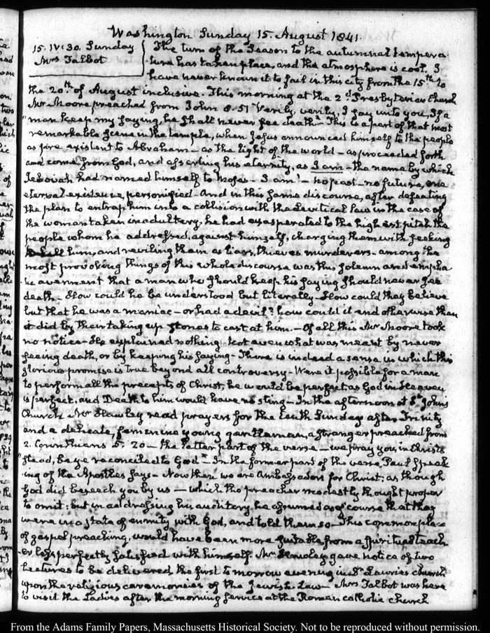 View full, authoritative transcriptions with page images of the diaries at John Quincy Adams Digital Diary part of the Primary Source Cooperative at the MHS.