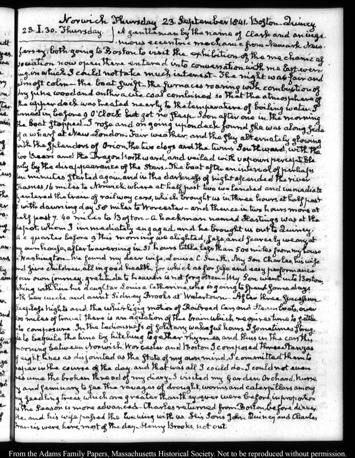 View full, authoritative transcriptions with page images of the diaries at John Quincy Adams Digital Diary part of the Primary Source Cooperative at the MHS.