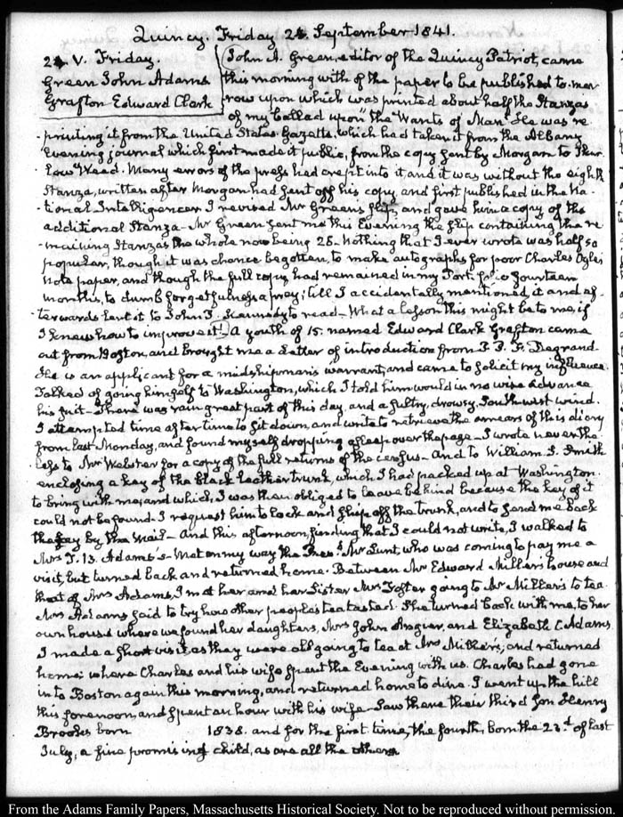 View full, authoritative transcriptions with page images of the diaries at John Quincy Adams Digital Diary part of the Primary Source Cooperative at the MHS.