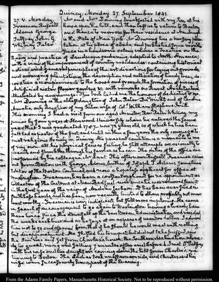View full, authoritative transcriptions with page images of the diaries at John Quincy Adams Digital Diary part of the Primary Source Cooperative at the MHS.