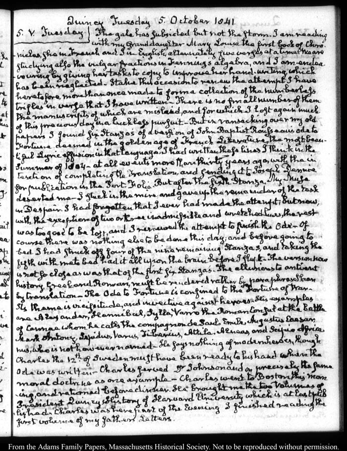 View full, authoritative transcriptions with page images of the diaries at John Quincy Adams Digital Diary part of the Primary Source Cooperative at the MHS.