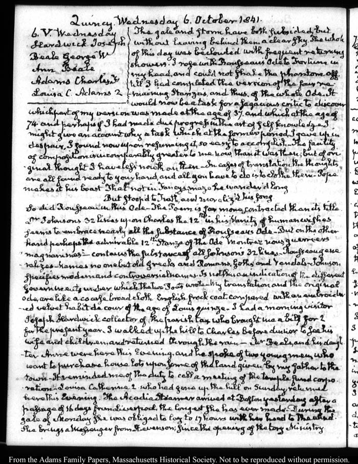 View full, authoritative transcriptions with page images of the diaries at John Quincy Adams Digital Diary part of the Primary Source Cooperative at the MHS.