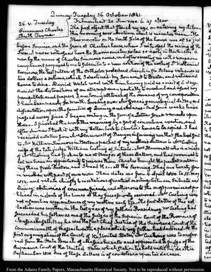 View full, authoritative transcriptions with page images of the diaries at John Quincy Adams Digital Diary part of the Primary Source Cooperative at the MHS.
