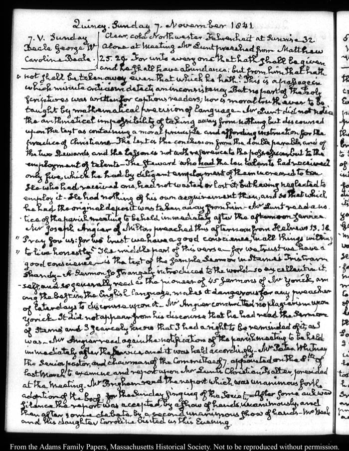 View full, authoritative transcriptions with page images of the diaries at John Quincy Adams Digital Diary part of the Primary Source Cooperative at the MHS.