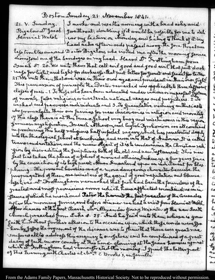 View full, authoritative transcriptions with page images of the diaries at John Quincy Adams Digital Diary part of the Primary Source Cooperative at the MHS.