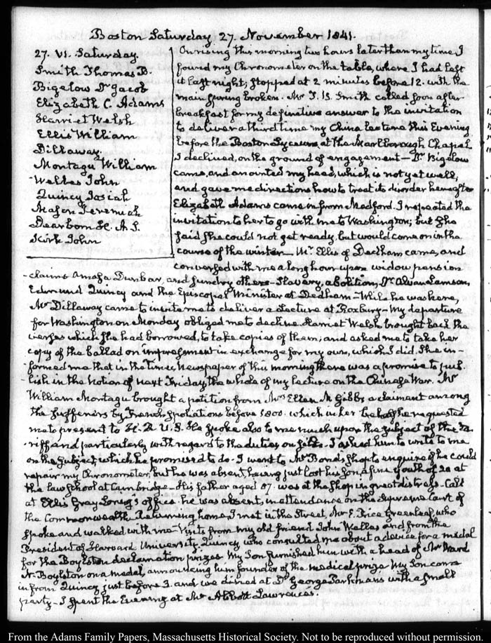 View full, authoritative transcriptions with page images of the diaries at John Quincy Adams Digital Diary part of the Primary Source Cooperative at the MHS.