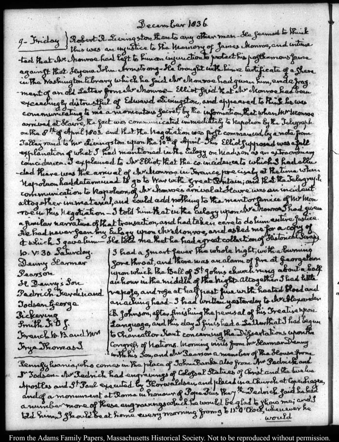 View full, authoritative transcriptions with page images of the diaries at John Quincy Adams Digital Diary part of the Primary Source Cooperative at the MHS.