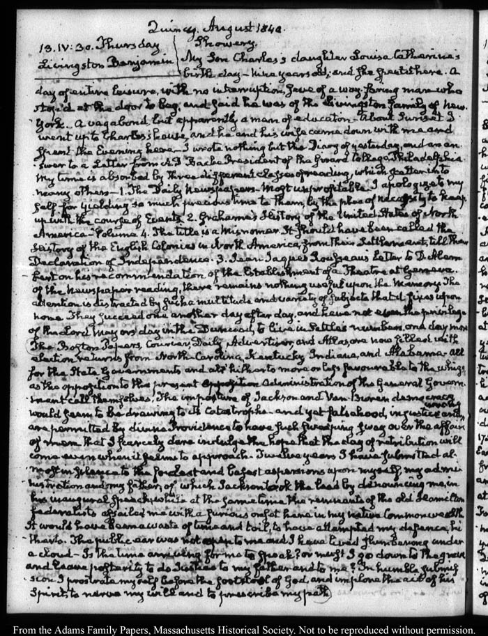 View full, authoritative transcriptions with page images of the diaries at John Quincy Adams Digital Diary part of the Primary Source Cooperative at the MHS.