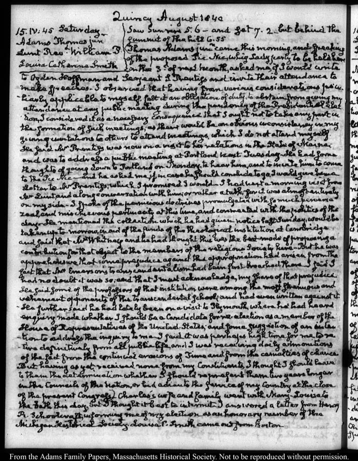 View full, authoritative transcriptions with page images of the diaries at John Quincy Adams Digital Diary part of the Primary Source Cooperative at the MHS.