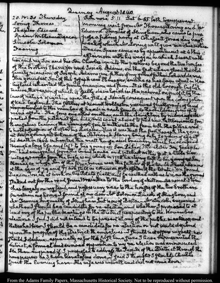 View full, authoritative transcriptions with page images of the diaries at John Quincy Adams Digital Diary part of the Primary Source Cooperative at the MHS.