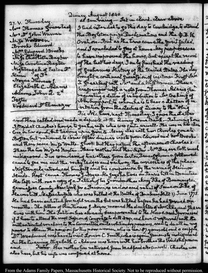 View full, authoritative transcriptions with page images of the diaries at John Quincy Adams Digital Diary part of the Primary Source Cooperative at the MHS.