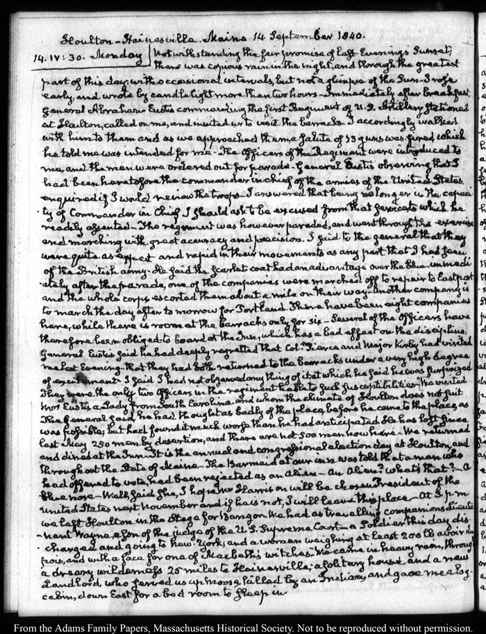 View full, authoritative transcriptions with page images of the diaries at John Quincy Adams Digital Diary part of the Primary Source Cooperative at the MHS.