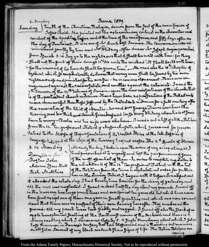 View full, authoritative transcriptions with page images of the diaries at John Quincy Adams Digital Diary part of the Primary Source Cooperative at the MHS.