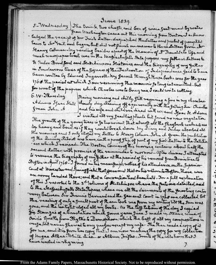 View full, authoritative transcriptions with page images of the diaries at John Quincy Adams Digital Diary part of the Primary Source Cooperative at the MHS.