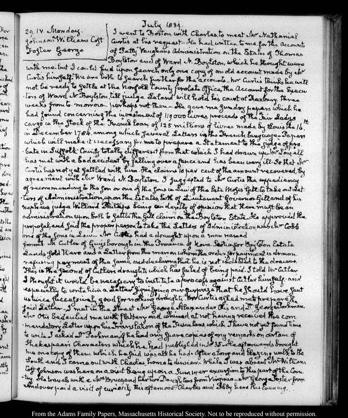 View full, authoritative transcriptions with page images of the diaries at John Quincy Adams Digital Diary part of the Primary Source Cooperative at the MHS.