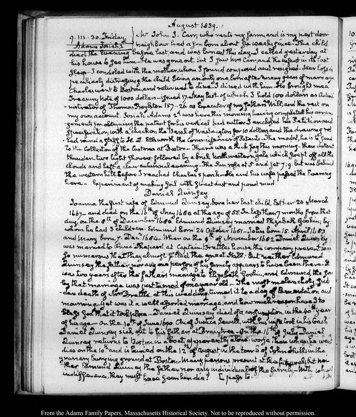 View full, authoritative transcriptions with page images of the diaries at John Quincy Adams Digital Diary part of the Primary Source Cooperative at the MHS.
