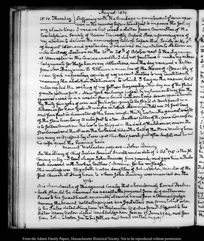 View full, authoritative transcriptions with page images of the diaries at John Quincy Adams Digital Diary part of the Primary Source Cooperative at the MHS.