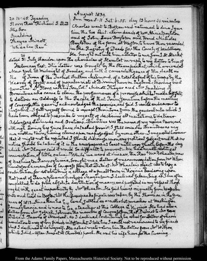 View full, authoritative transcriptions with page images of the diaries at John Quincy Adams Digital Diary part of the Primary Source Cooperative at the MHS.
