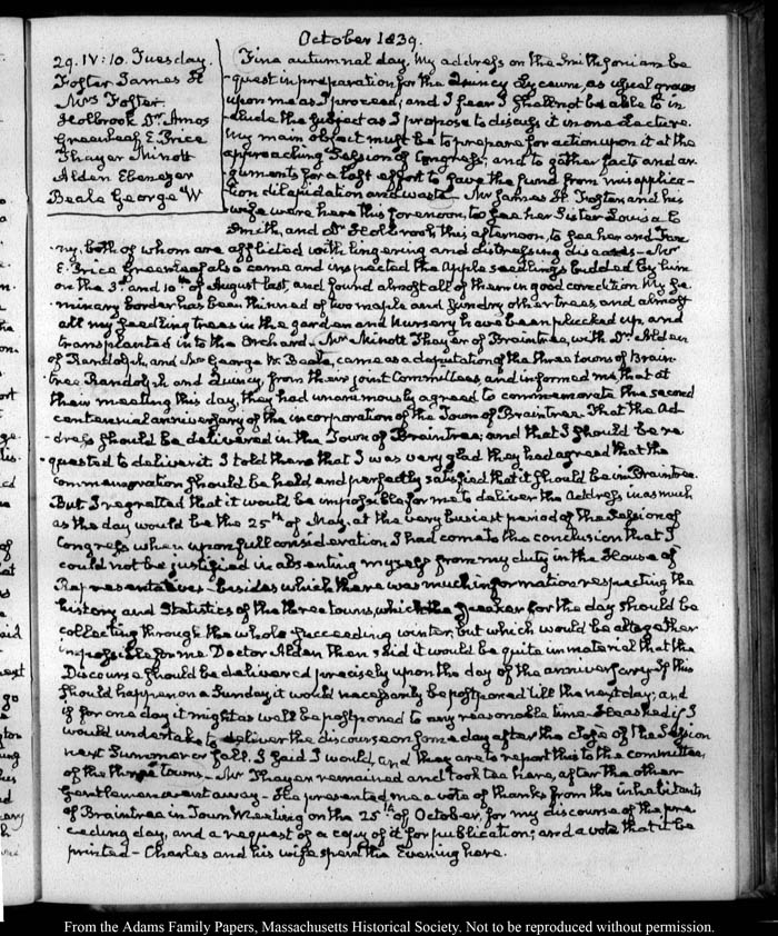 View full, authoritative transcriptions with page images of the diaries at John Quincy Adams Digital Diary part of the Primary Source Cooperative at the MHS.