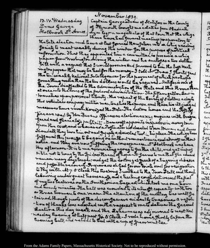 View full, authoritative transcriptions with page images of the diaries at John Quincy Adams Digital Diary part of the Primary Source Cooperative at the MHS.